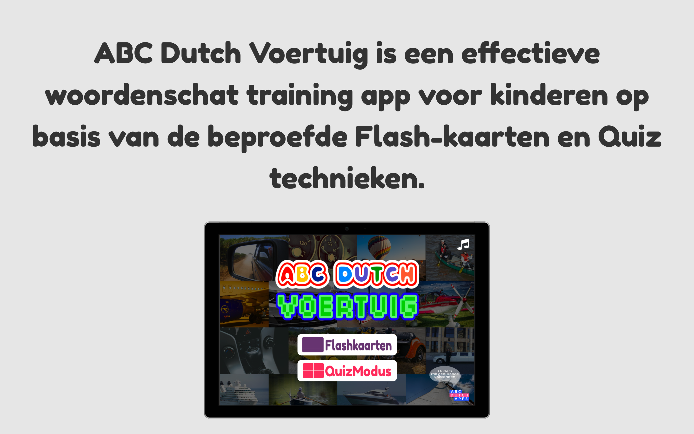 ABC Dutch Voertuig is een effectieve woordenschat training app voor kinderen op basis van de beproefde Flash-kaarten en Quiz technieken.